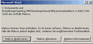 Die Makro-Funktion von Word muss aktiviert werden. Wichtig ist, dass Sie Word über das Menü Extras -> Makro -> Sicherheit auf die mittlere Sicherheits-Stufe einstellen, damit Makros in Word-Dokumenten überhaupt aktiviert werden können. Sie haben jedes mal, wenn Sie ein Worddokument mit Makros öffnen, die Wahl diese zu aktivieren oder zu deaktivieren. Um den Lernmoduleditor nutzen zu können, müssen Sie die Makros aktivieren.
