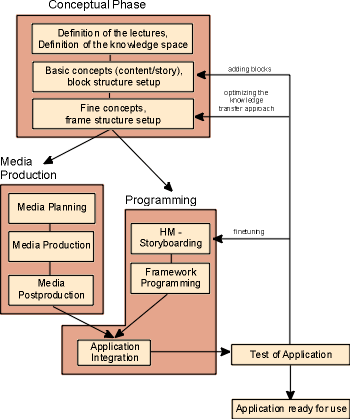 Zur Strukturierung des Produktionsprozesses werden bewährte methodische Modelle herangezogen und um spezifische Elemente der Produktion digitaler Lektionen ergänzt. Angelehnt an das bekannte Modell des Software-Lebenszyklus kann der Produktionsprozeß von DIALEKT-Lektionen wie folgt skizziert werden: Abb. 1: Der Lifecycle einer Digitalen Lektion Die Phase der Konzeption bildet die Grundlage für den Produktionsprozeß einer Applikation. In den meisten Fällen existiert bereits Informations- und Lehrmaterial in großem Umfang. Da jedoch in der Regel keine identische Umsetzung des herkömmlichen Lehrmaterials vorgenommen werden kann, steht eine Neugliederung der Inhalte am Anfang. Diese Phase im Produktionsprozeß entspricht sicher noch am ehesten einer klassischen Vorgehensweise. Das inhaltliche Grobkonzept als Ergebnis dieser Phase kann bereits Hinweise auf die Art des multiplen Medieneinsatzes beinhalten. Sofern auch narrative Elemente vorgesehen sind, können diese bereits hier angedeutet werden, um die Dramaturgie der Anwendung zu erläutern. Dennoch sollte ausreichend Raum für abweichende Formen der Navigation und der Interaktion gelassen werden. Je feiner die Konzepte entwickelt werden, desto intensiver können auch die technischen Aspekte beim späteren Einsatz der Applikation beachtet werden. Es ist wichtig, daß sich die Autoren ihrer technischen Möglichkeiten und Restriktionen bewußt sind, um ihnen ausreichend Raum für die Umsetzung ihrer didaktischen Konzepte zu geben. Zu diesem Zweck wurde ein bewährtes Beschreibungsverfahren aus der Medienproduktion (Storyboarding) entlehnt und um die spezifischen Anforderungen digitaler Lektionen ergänzt. Auf diese Weise lernen Programmierer und Autoren, eine "gemeinsame Sprache" zu sprechen. Aspekte der Medienproduktion und Medienintegration haben gleichermaßen methodische wie technische Dimensionen. Insbesondere die Verwendung von Videosequenzen ist nach wie vor eine Herausforderung. Da der Produktionsaufwand für Videos relativ hoch ist, erscheint es wünschenswert, diese Medien auch in anderen inhaltlichen Zusammenhängen wieder zu verwenden. Im Gegensatz zu einem kompletten Film sollte eine digitale Lektion jedoch mit der Veränderung und Erweiterung des repräsentierten Wissens Schritt halten. Auf der anderen Seite müssen die Programmierer lernen, mit digitalen Objekten umzugehen, die nur schwer kontinuierlich reproduziert werden können. Idealerweise sind die Konzepte ausreichend detailliert formuliert, so daß Programmierung und Medienproduktion gleichzeitig stattfinden können. Ein weiteres wichtiges Ziel bei der Entwicklung digitaler Lektionen ist die Offenheit bzgl. sich verändernder und neuer Lehrinhalte. Zu diesem Zweck wurde ein generisches Framework (siehe Abbildung 2) entwickelt. Dieses Framework enthält - neben einer Datenbank - einen anwendungsabhängigen und einen anwendungsunabhängigen Teil. Solange sich in der grundlegenden Struktur und dem Charakter einen neuen Lektion nichts ändert (z.B. Möglichkeiten der Navigation, Medienbehandlung etc.), bleibt der unabhängige Teil über die diversen Lektionen hinweg weitgehend unberührt. Abb. 2: Das Framework von DIALEKT Der anwendungsabhängige Teil enthält ausschließlich die zur Präsentation der jeweiligen Lehrinhalte notwendigen Seitenbeschreibungen. Im Falle der Verwendung des Frameworks für eine neue Lektion müssen lediglich diese Seitenbeschreibungen ausgetauscht werden. In der Phase der Integration der verschiedenen Komponenten wird deutlich, ob die eigentliche Implementierung gut geplant und koordiniert war. Da alle Medienobjekte (Texte, Bilder, Grafiken, Tabellen, Worksheets, Audios, Videos, Animationen) außerhalb des Frameworks gespeichert und über die Lektionsdatenbank verwaltet werden, sind nachträgliche Änderungen an den Inhalten möglich, ohne daß Programmcode modifiziert werden muß. Die Testphase gibt schließlich Auskunft über die intuitive und interaktive Qualität der Benutzerschnittstelle, über die Effizienz der Navigationskontrolle und über die Angemessenheit von Präsentation und Transfer der Lehrinhalte. Entsprechende Anpassungen sind jederzeit möglich, solange die Kernlogik einer digitalen Lektion nicht betroffen ist. |