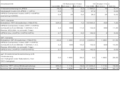 - die ermittelten Werte auf eine 10-minütige Videosequenz hochgerechnet:
